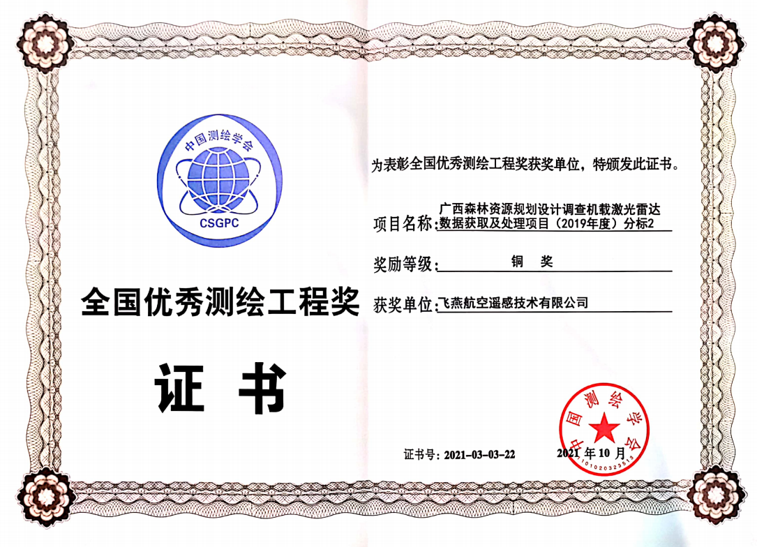 森林是人類(lèi)的搖籃,發(fā)達的林業(yè)是國家富裕、社會(huì )文明的重要標志。飛燕遙感承接的“廣西森林資源規劃設計調查機載激光雷達數據獲取及處理項目(2019年度)分標2”助力廣西林業(yè)分析,摸清“家底”,榮獲2021年度全國優(yōu)秀測繪工程獎銅獎。